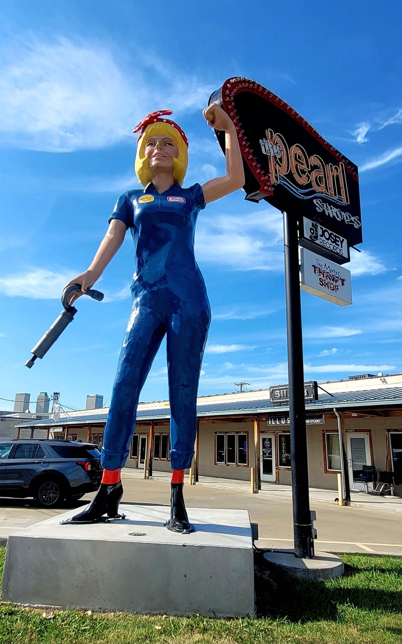 Rosie’s presence here is deeply personal. Aaron Meek, owner of The Pearl Shops, wanted this Uniroyal Girl to become Rosie the Riveter as a tribute to his mother, who worked at McDonnell Douglas during World War II. Like so many women of that era, she stepped into industrial work to support the war effort—helping shape history in ways that often went uncelebrated.