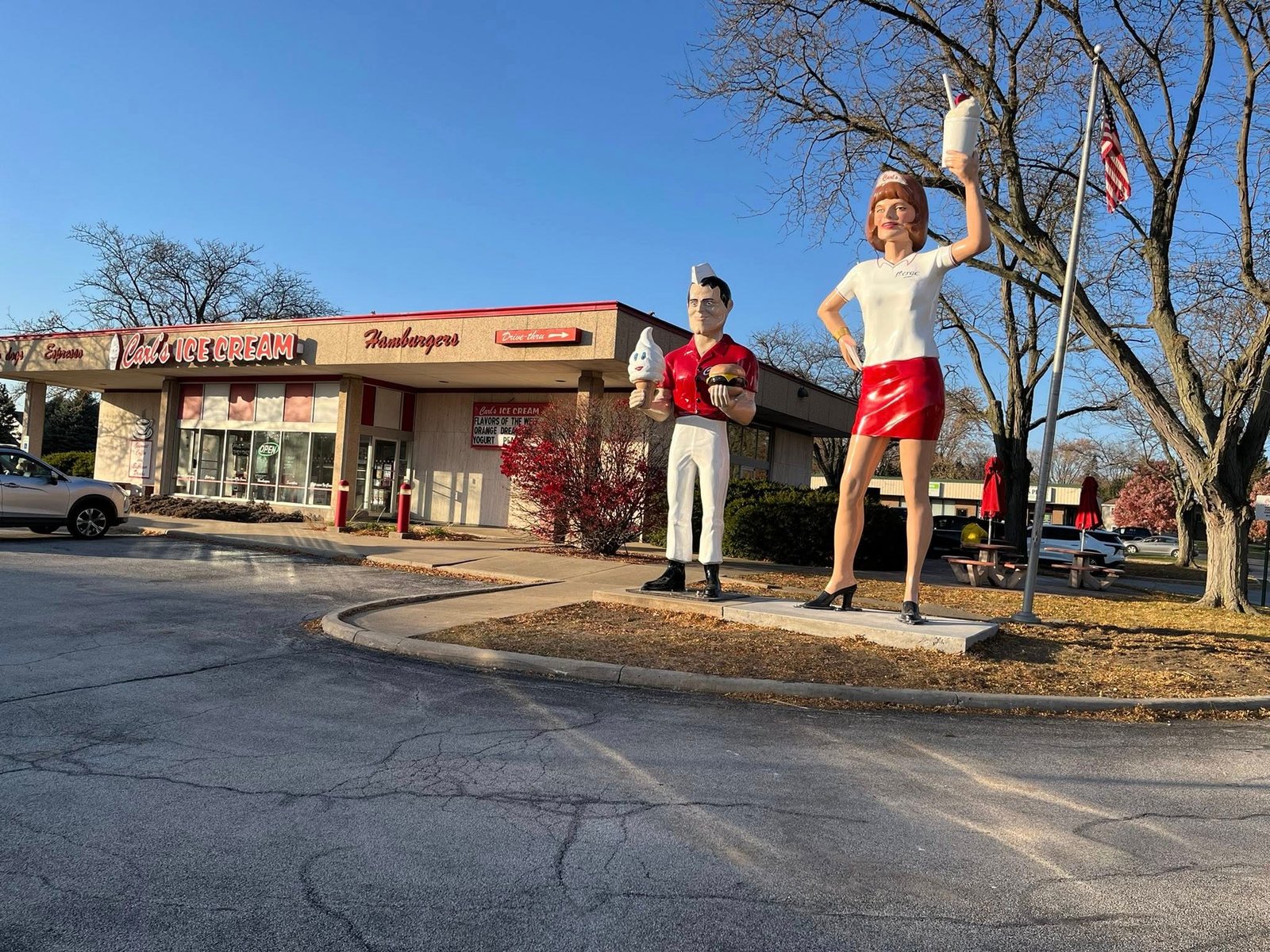 Marge is a former Uniroyal Gal, but she’s far more than just a repurposed roadside figure. She’s named after **real people—Carl Garbe and Marge Irwin—**who once worked at Carl’s Ice Cream decades ago and likely never imagined they’d one day be immortalized in giant-sized fiberglass. It’s one of those small-town stories that Route 66 does best: personal, unexpected, and deeply charming.