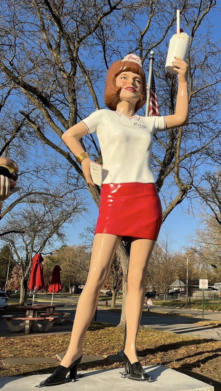 She now wears a red-and-white uniform color-coordinated with Carl the Chef, complete with a bouffant hairstyle topped by a sparkling “Carl’s” tiara. In her right hand, she clutches an order book, ready to take requests. And in her raised left hand—once designed to hold a Uniroyal tire—she now lifts a milkshake skyward, like the torch of the Statue of Liberty, welcoming travelers to stop, smile, and stay awhile.