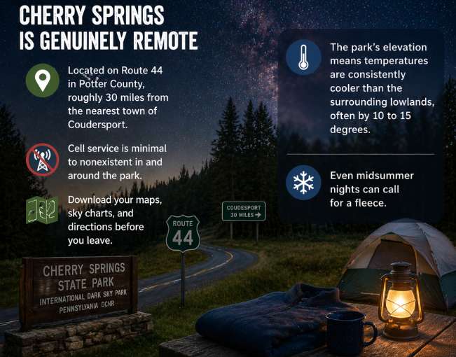 Cherry Springs is genuinely remote—located on Route 44 in Potter County, roughly 30 miles from the nearest town of Coudersport. Cell service is minimal to nonexistent in and around the park; download your maps, sky charts, and directions before you leave. The park’s elevation means temperatures are consistently cooler than the surrounding lowlands, often by 10 to 15 degrees. Even midsummer nights can call for a fleece.